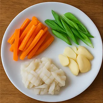 4. 채소 투입: 양파·양배추·당근을 넣고 숨이 죽을 때까지만 볶는다.