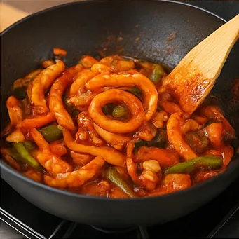3. 빠른 볶기: 오징어와 양념장을 센 불에서 볶은 뒤 채소를 넣어 마무리한다.